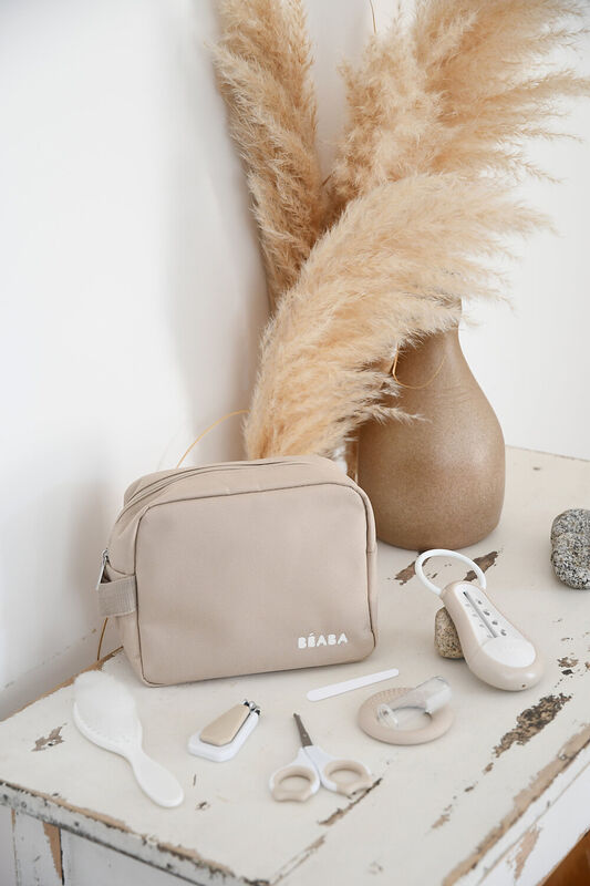 Deze compacte toilettas voor babyverzorging bevat 7 onmisbare accessoires: een badthermometer, schaar, nagelknipper, haarborstel, bijtring, tandvleesmassager en nagelvijl. Alles is zorgvuldig geselecteerd voor de dagelijkse hygiëne en verzorging van je baby.