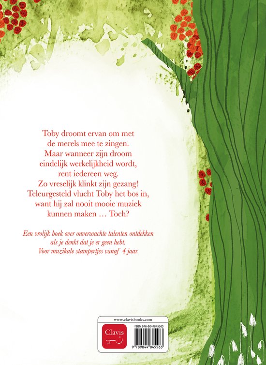 Toby droomt ervan om met de merels mee te zingen. Maar wanneer zijn droom eindelijk werkelijkheid wordt, rent iedereen weg. Zo vreselijk klinkt zijn gezang! Teleurgesteld vlucht Toby het bos in, want hij zal nooit mooie muziek kunnen maken … Toch? Een vrolijk boek over onverwachte talenten ontdekken als je denkt dat je er geen hebt. Voor muzikale stampertjes vanaf 4 jaar.