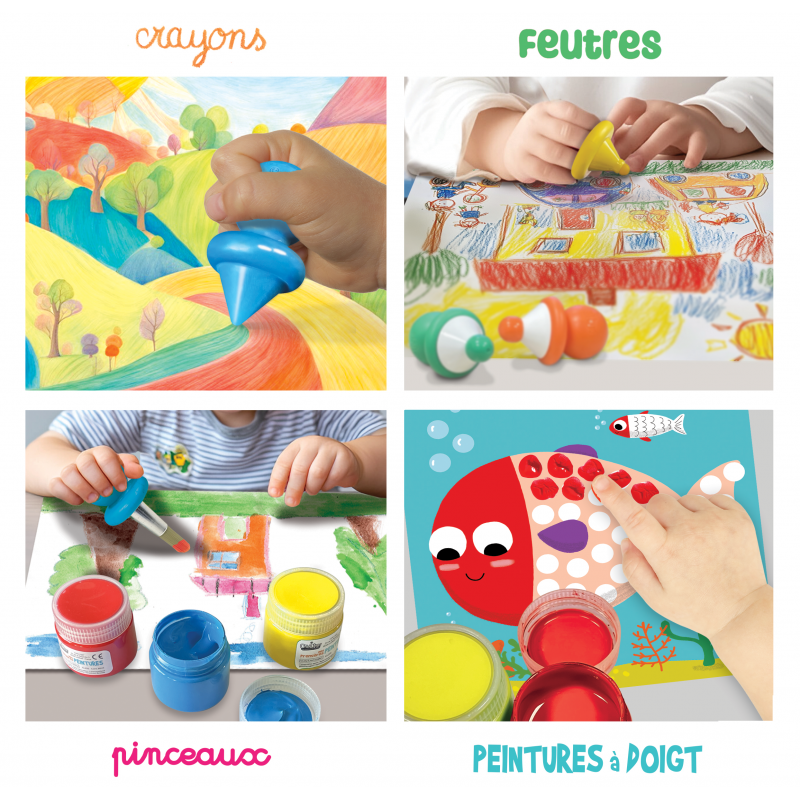 Leuke set van 15 ergonomische stiften, verf, krijtjes... voor peuters vanaf 12 maanden. Een heel complete startset om vanaf 1 jaar aan de slag te gaan met knutselen. Er zitten gekleurder viltstiften in, verfborsteld, kleurkrijtjes en vingerverf. Veilig aan de slag gaan dus met heel veel crea plezier.