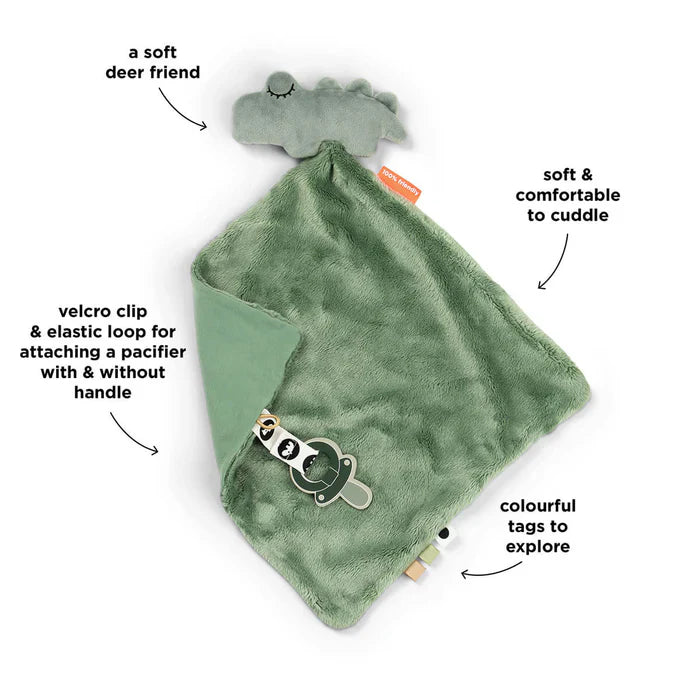 Geef je kleintje een heerlijk zacht en vertrouwd vriendje met dit superzachte knuffeldoekje – perfect voor knuffels, rustmomentjes en extra comfort vanaf 0 maanden. De verschillende texturen en speelse labeltjes prikkelen de zintuigen en nodigen uit tot ontdekken, voelen en grijpen. Dankzij het praktische klittenbandclipje blijft de fopspeen altijd binnen handbereik, zowel thuis als onderweg.