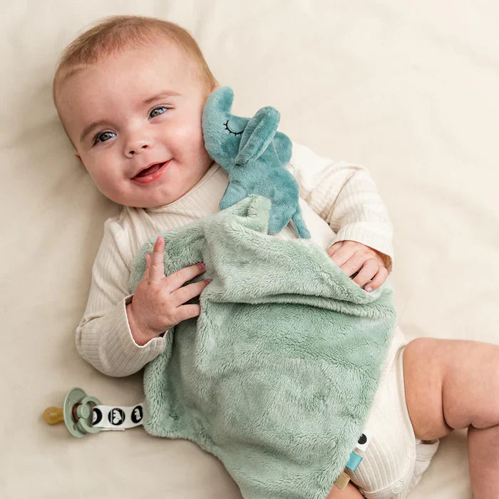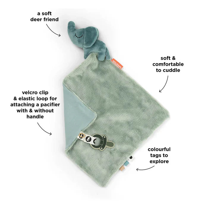 Geef je kleintje een heerlijk zacht en vertrouwd vriendje met dit superzachte knuffeldoekje – perfect voor knuffels, rustmomentjes en extra comfort vanaf 0 maanden. De verschillende texturen en speelse labeltjes prikkelen de zintuigen en nodigen uit tot ontdekken, voelen en grijpen. Dankzij het praktische klittenbandclipje blijft de fopspeen altijd binnen handbereik, zowel thuis als onderweg.