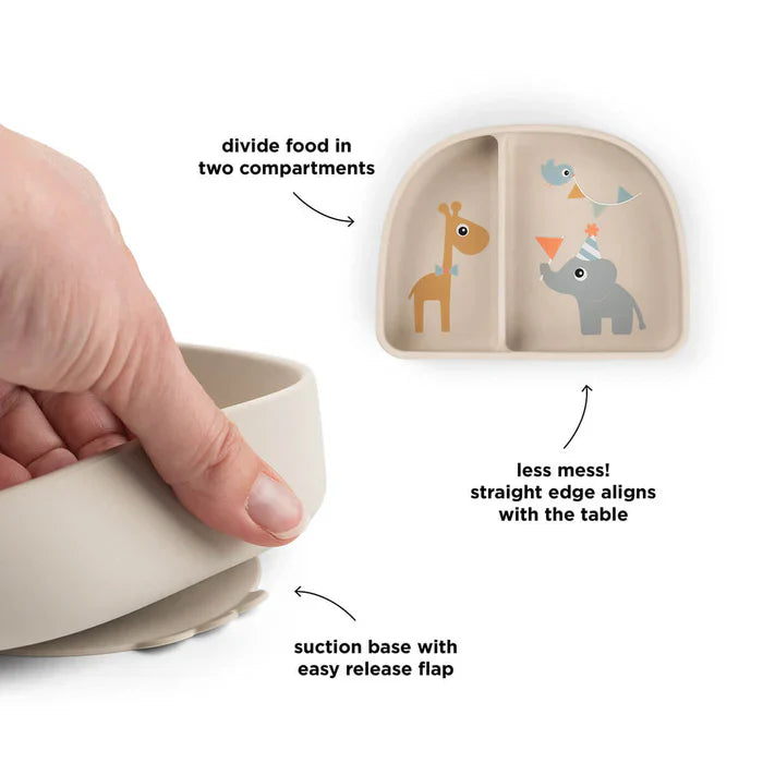 Maak van elk eetmoment een succes met deze slimme siliconen kom met zuignap – ideaal voor kindjes die volop willen oefenen met zelfstandig eten. De rechte rand sluit netjes aan tegen de tafel, waardoor er minder gemorst wordt. De twee compartimenten hebben verschillende groottes, perfect om smaken gescheiden te houden en je kleintje op een speelse manier nieuwe hapjes te laten ontdekken.