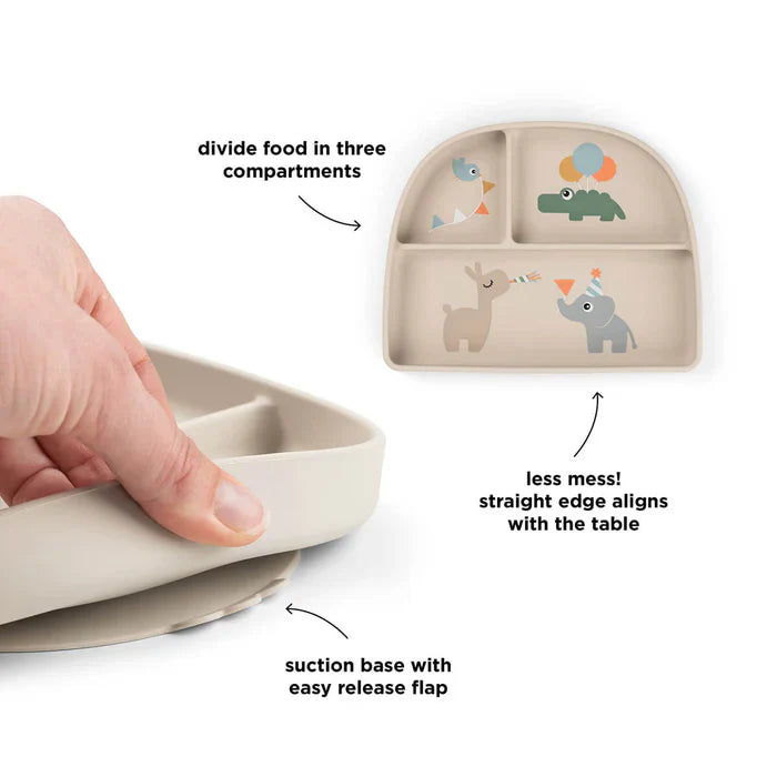 Maak van elke maaltijd een succes met dit slimme siliconen compartimentenbord met sterke zuignap. De rechte rand sluit mooi aan tegen de tafel, waardoor er minder gemorst wordt en je kindje makkelijker kan scheppen. De drie apart gevormde vakken bieden ruimte voor verschillende smaken en texturen — ideaal voor kleine eters die graag zelf ontdekken.