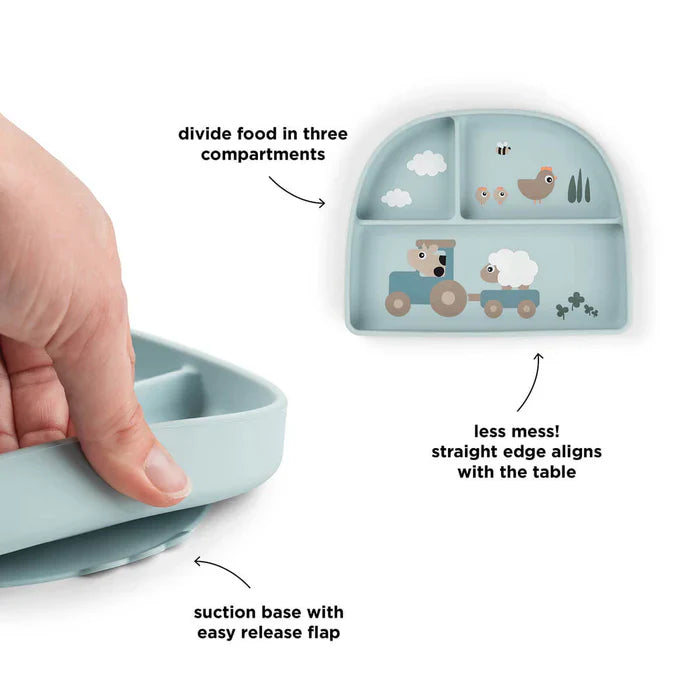 Maak van elke maaltijd een succes met dit slimme siliconen compartimentenbord met sterke zuignap. De rechte rand sluit mooi aan tegen de tafel, waardoor er minder gemorst wordt en je kindje makkelijker kan scheppen. De drie apart gevormde vakken bieden ruimte voor verschillende smaken en texturen — ideaal voor kleine eters die graag zelf ontdekken.