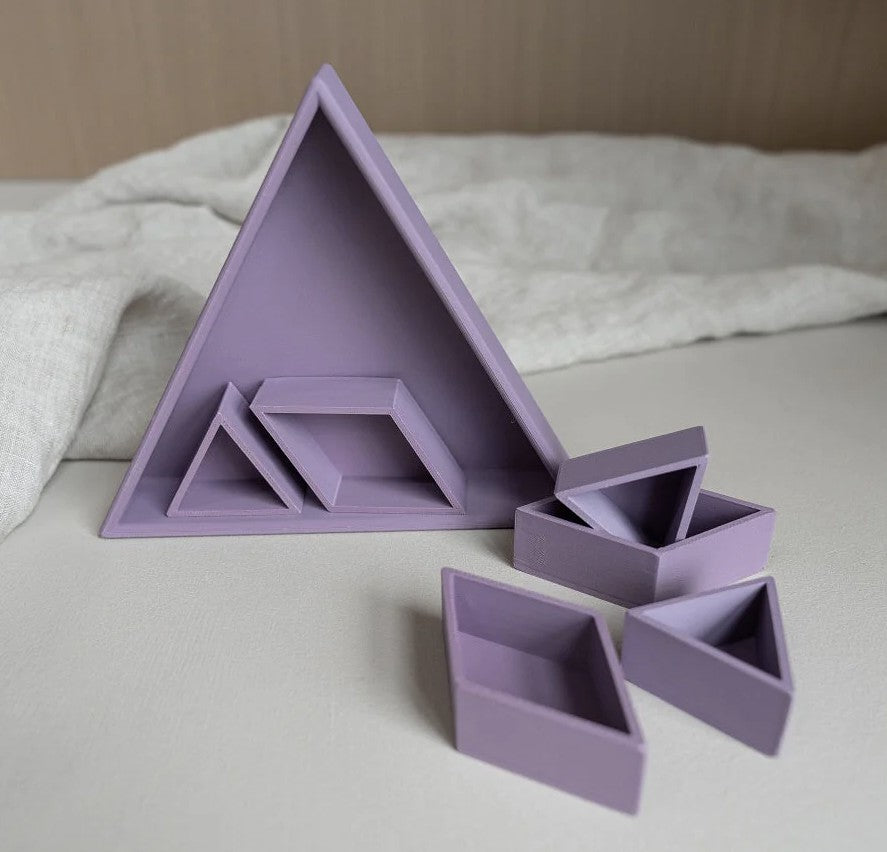 De vorm van de driehoek creëert een duidelijk en stevig vakje. Dat maakt het sorteren van materialen heel eenvoudig. Magic sand, speelrijst, kleine accessoires, stekers of mini speelgoed krijgen allemaal hun eigen plek.