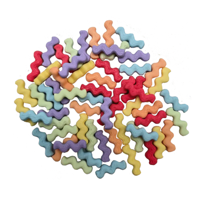 De set bestaat uit 60 mini golven in verschillende pastelkleuren. Dankzij hun compacte formaat passen ze makkelijk in kinderhanden en kunnen ze eindeloos gecombineerd worden met ander open einde speelgoed. Licht van gewicht, duurzaam van materiaal en makkelijk op te bergen – ideaal dus voor thuis, in de klas of op reis.