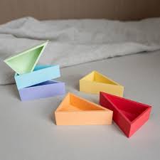 De mandigo driehoek bakjes zijn ontworpen om materialen overzichtelijk te sorteren tijdens sensorisch spel. Elk bakje heeft dezelfde vorm en kan eenvoudig gecombineerd worden met andere kleuren. Ze zijn verkrijgbaar in zowel regenboog- als pasteltinten, zodat je precies het kleurenpalet kunt kiezen dat past bij jouw speelhoek of thema.