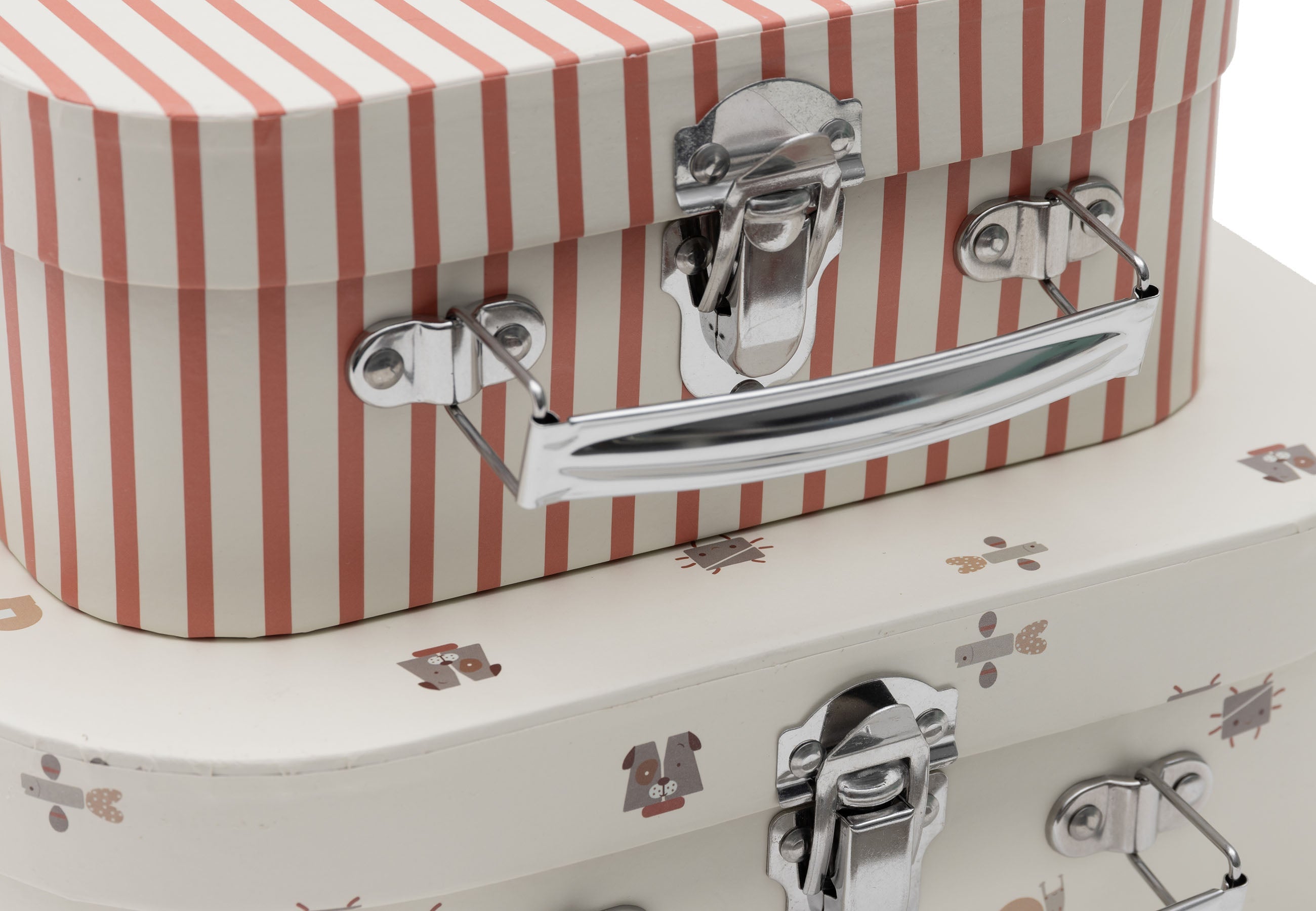 De koffertjes hebben verschillende prints en zachte kleuren, met zilverkleurige handvatten die zorgen voor een speelse uitstraling.
