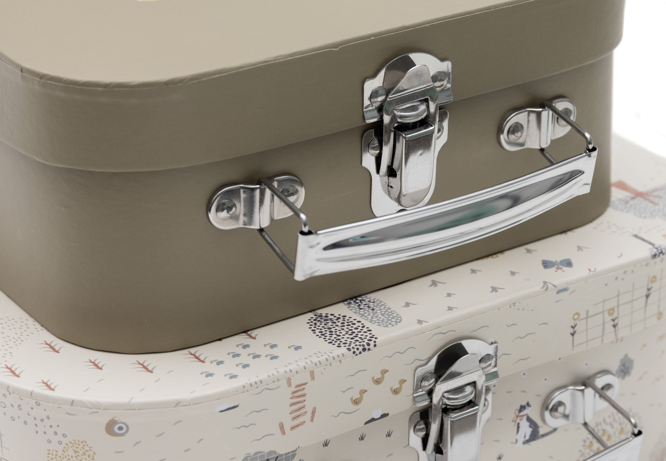 De koffertjes hebben verschillende prints en zachte kleuren, met zilverkleurige handvatten die zorgen voor een speelse uitstraling.