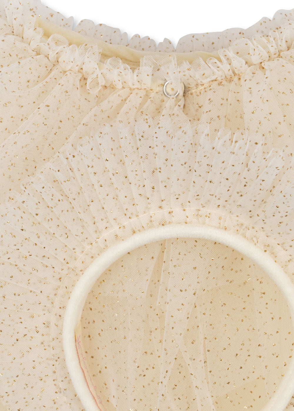 Kostuum met een lichte tule cape en decoratieve haarband. Geschikt vanaf 3j.