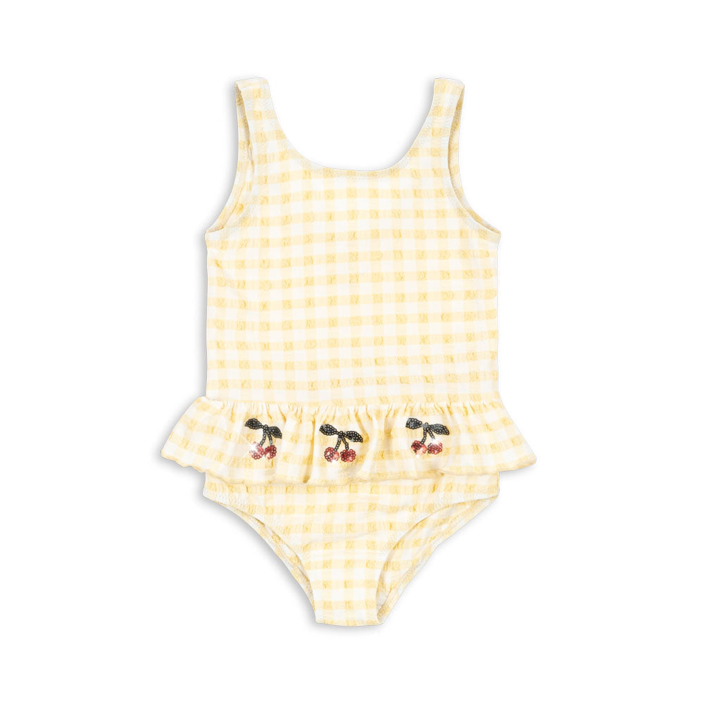 Een klassiek badpak in een getextureerde seersucker stof, afgewerkt met schattige ruches en kersvormige pailletten voor een speelse en zomerse uitstraling. Perfect voor lange dagen aan het strand of bij het zwembad.