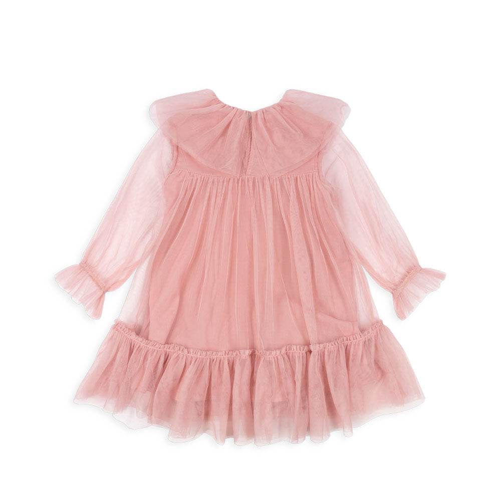 Zachte tule jurk met een kraag en een decoratieve strik aan de voorkant.