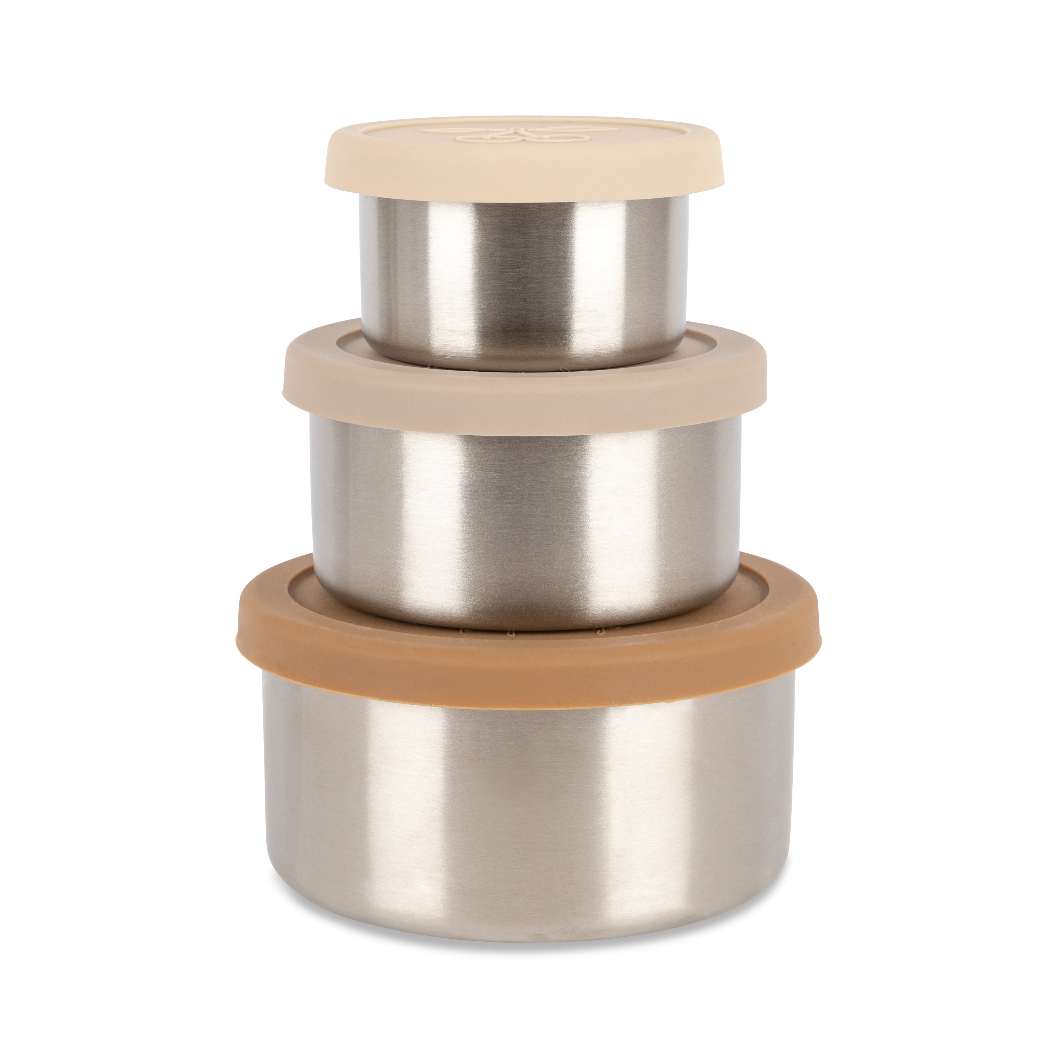 Deze set van 3 Lunch Boxes is gemaakt van roestvrij staal met een siliconen zuignapdeksel en een fruit- of croissantmotief in reliëf op elk deksel. De kleinere schaaltjes passen in de grotere schaaltjes.