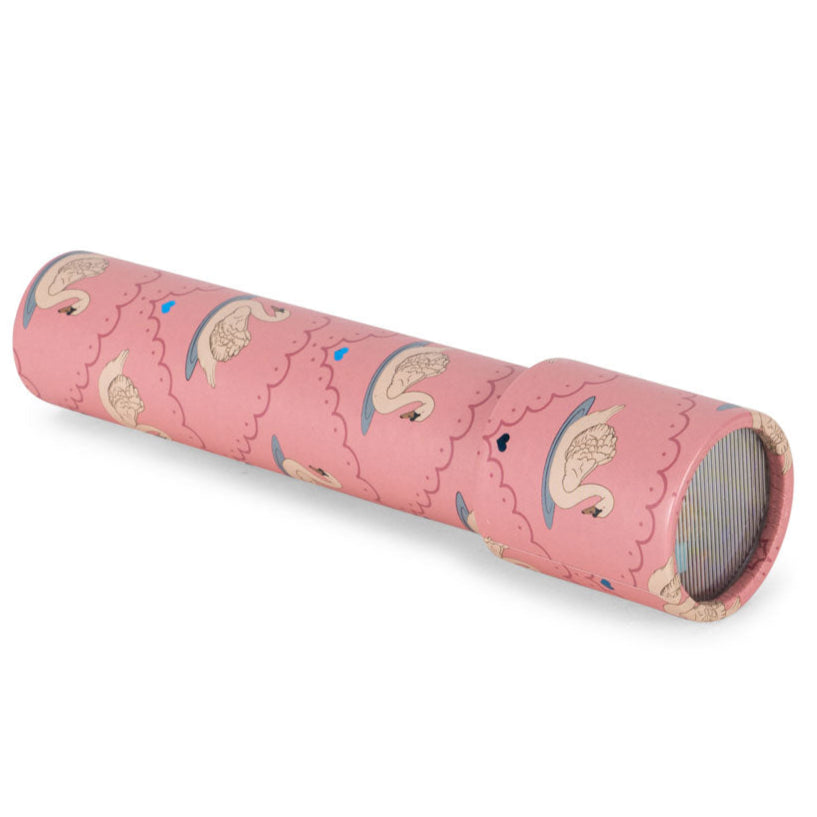 Een kaleidoscoop met parels langs de binnenkant. Kijk door de kaleidoscoop en geniet van de verschillende kleuren en patronen.