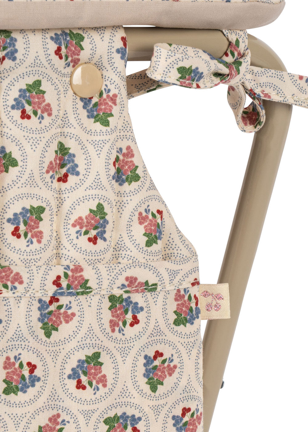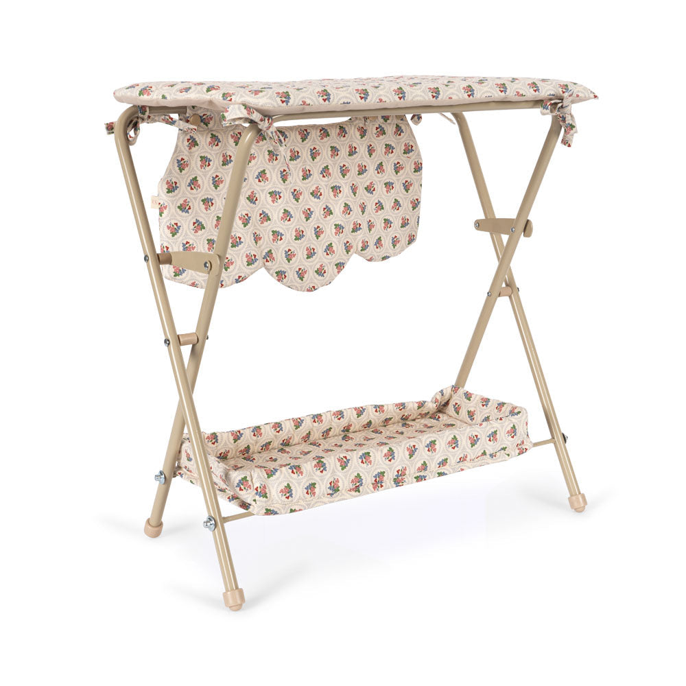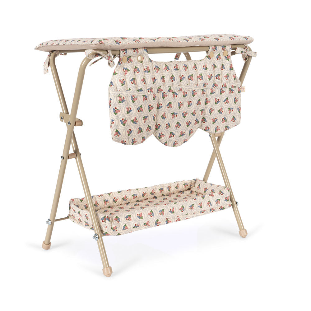 Poppencommode met een robuust metalen frame en een gewatteerd blad. Voldoende ruimte om de spullen van je pop eronder en in de zakken aan de zijkant op te bergen.