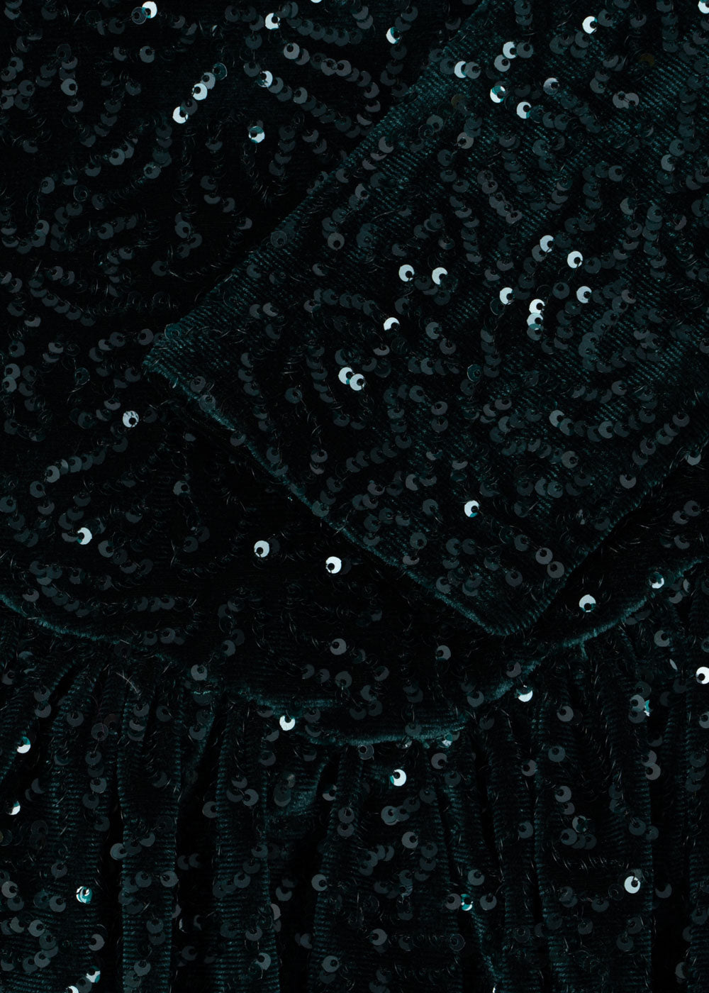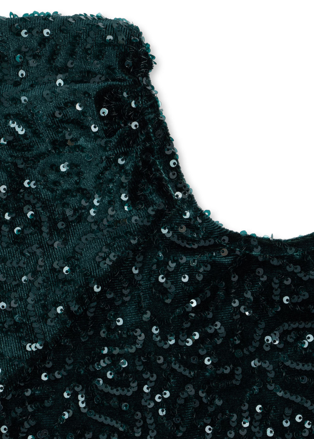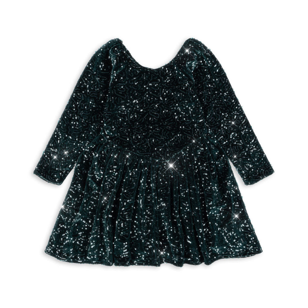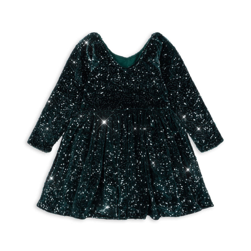 Zachte en sprankelende fluwelen jurk met all-over pailletten opzetstukken.
