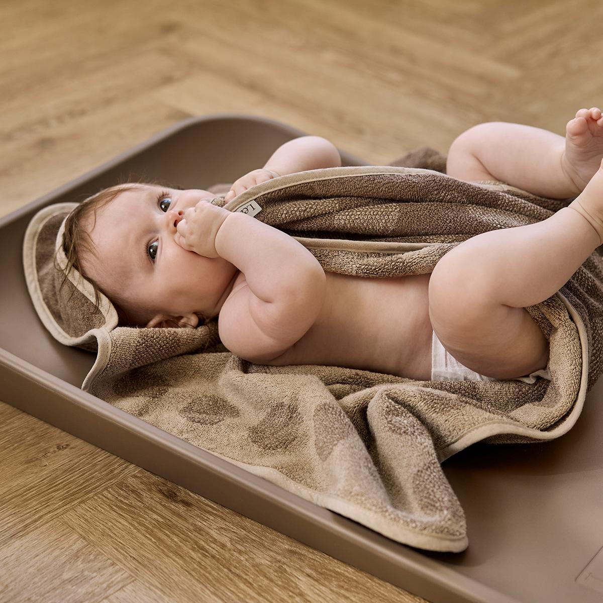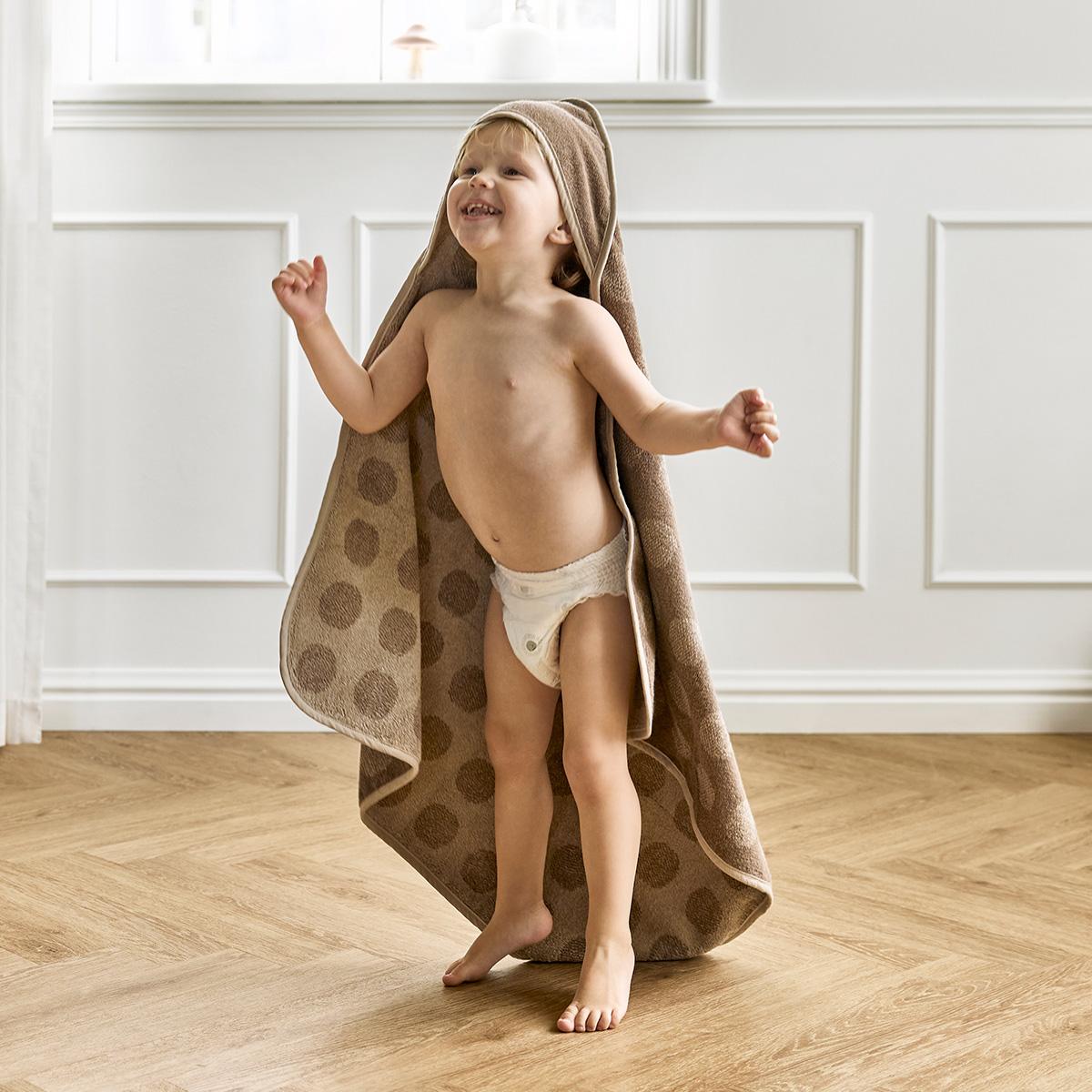 De badcape is gemaakt van hoogwaardig organisch katoen dat vriendelijk is voor de gevoelige babyhuid en tegelijkertijd duurzaam en gemakkelijk te onderhouden is.