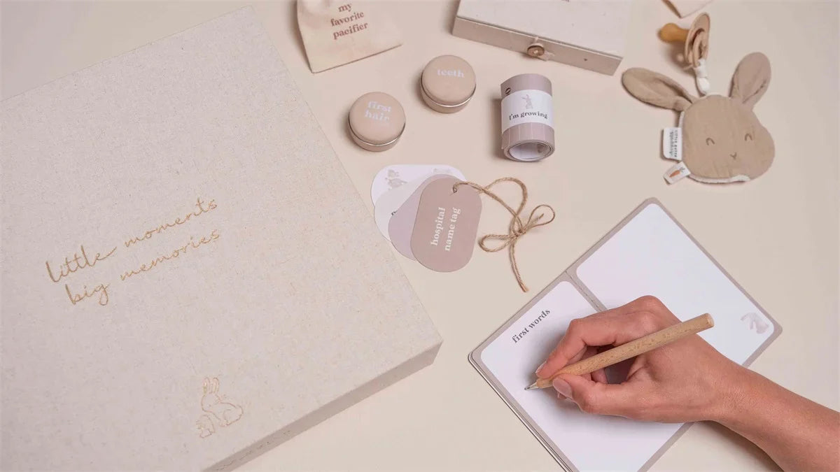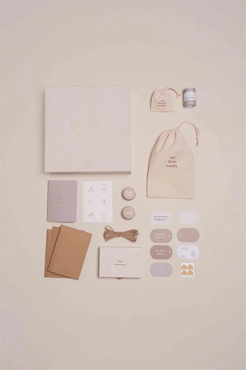 De box bevat een envelopje voor het eerste haarlokje, een katoenen zakje voor de eerste schoentjes, een katoenen zakje voor het favoriete speentje, kleine doosjes voor de eerste tandjes, wensen, herinneringen en voorwerpen, een meetlint om de groei van het kind bij te houden, kaarten voor echofoto’s, een afdruk van de handjes en voetjes, voor baby’s eerste woordjes en foto’s en voor speciale berichtjes van papa en mama, labels om aan de favoriete knuffel, kleding en aan het ziekenhuisbandje te hangen, blanco labels om zelf ter herinnering aan een voorwerp vast te maken.
