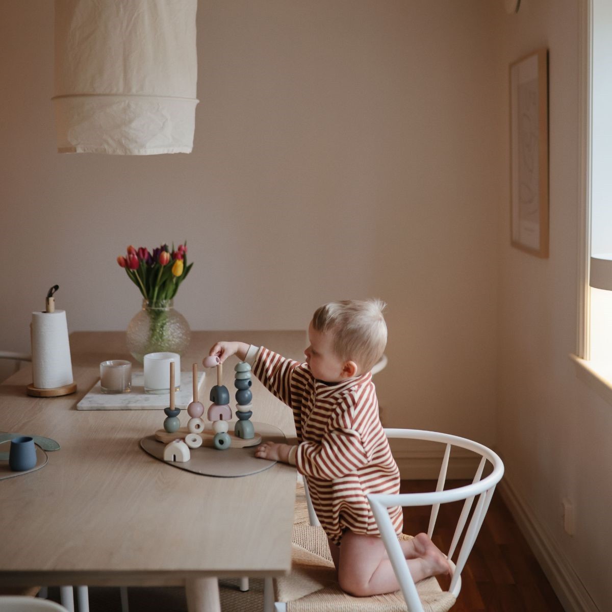 De stapelaar is gemaakt van FSC-gecertificeerd hout en afgewerkt met niet-giftige verf, voor een veilige en milieuvriendelijke speelervaring.