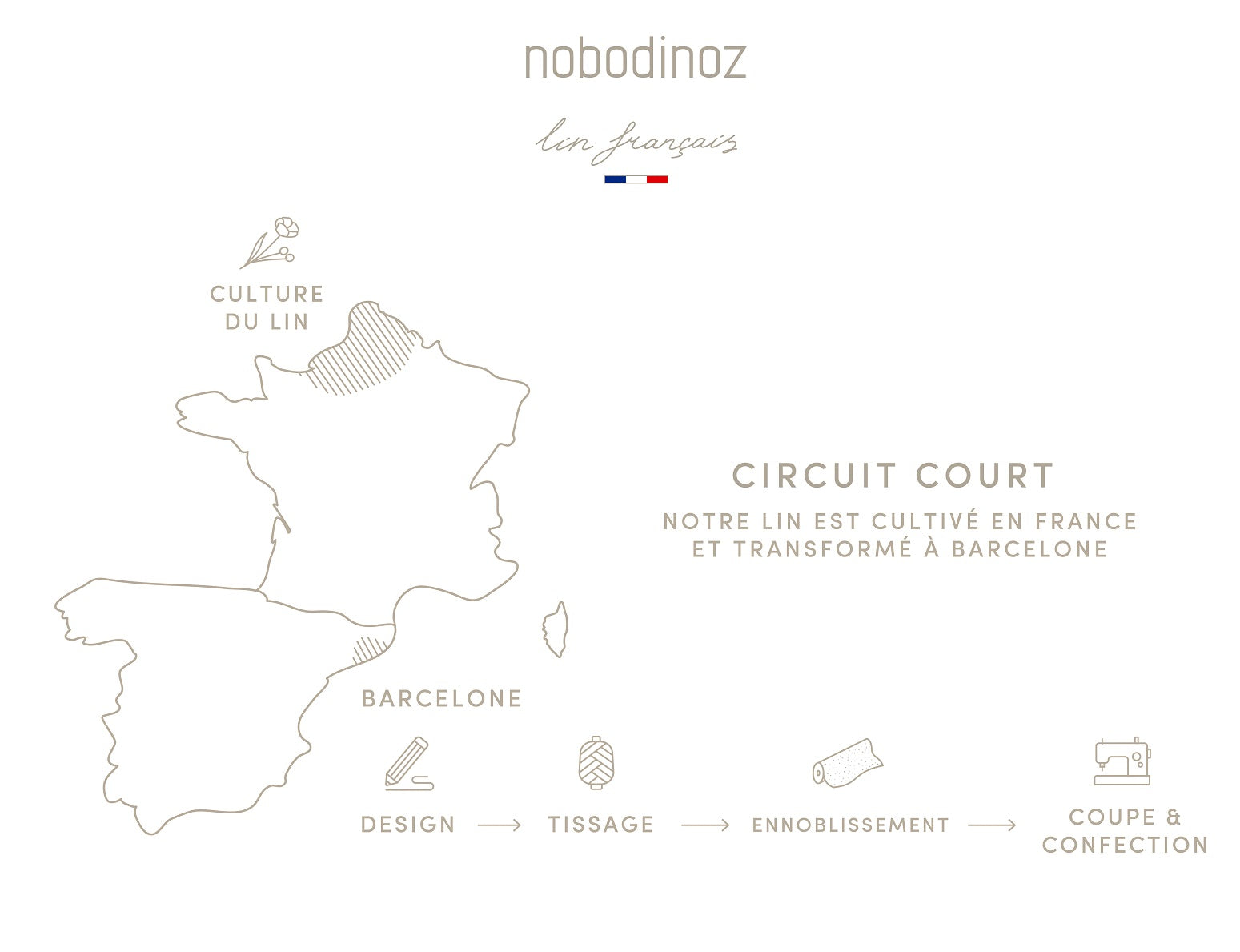 De nieuwste Lin Français collectie van Nobodinoz deelt deze filisofie volledig. De linnen die ze gebruikte in deze collectie is uitsluitend afkomstig van Franse oogsten. Deze linnen wordt vervolgens getransformeerd, afgewerkt en genaaid op 50 km afstand van hun kantoren in Barcelona. Deze korte lokale productieketen garandeert kwaliteit en minimaliseert de ecologische voetafdruk.