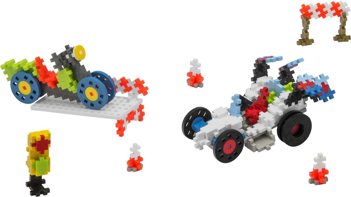 Met de Voertuigen set maken kinderen de coolste voertuigen helemaal zelf. De doos bevat 500 kleurrijke Plus‑Plus steentjes, 9 wielen en 2 chassis‑borden, zodat ze auto’s, motors, driewielers en nog veel meer kunnen bouwen.