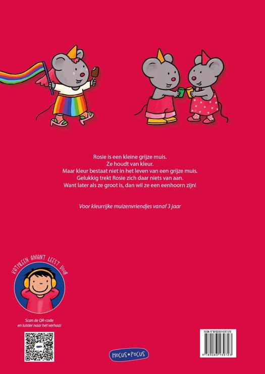 Rosie is een kleine grijze muis. Ze houdt van kleur. Maar kleur bestaat niet in het levenvan een grijze muis. Gelukkig trekt Rosie zich daar niets van aan. Want later als ze groot is, dan wil ze een eenhoorn zijn!