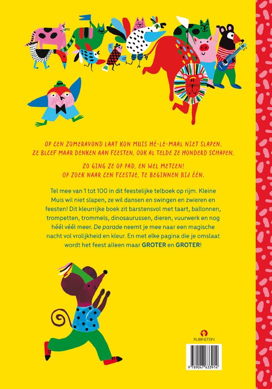 Tel mee van 1 tot 100 in dit feestelijke telboek op rijm. Kleine muis wil niet slapen, ze wil dansen en swingen en zwieren en feesten! Dit kleurrijke boek zit barstensvol met taart, ballonnen, trompetten, trommels, dinosaurussen, dieren, vuurwerk en nog héél véél meer. De parade neemt je mee naar een magische nacht vol vrolijkheid en kleur. En met elke pagina die je omslaat wordt het feest alleen maar groter en groter!