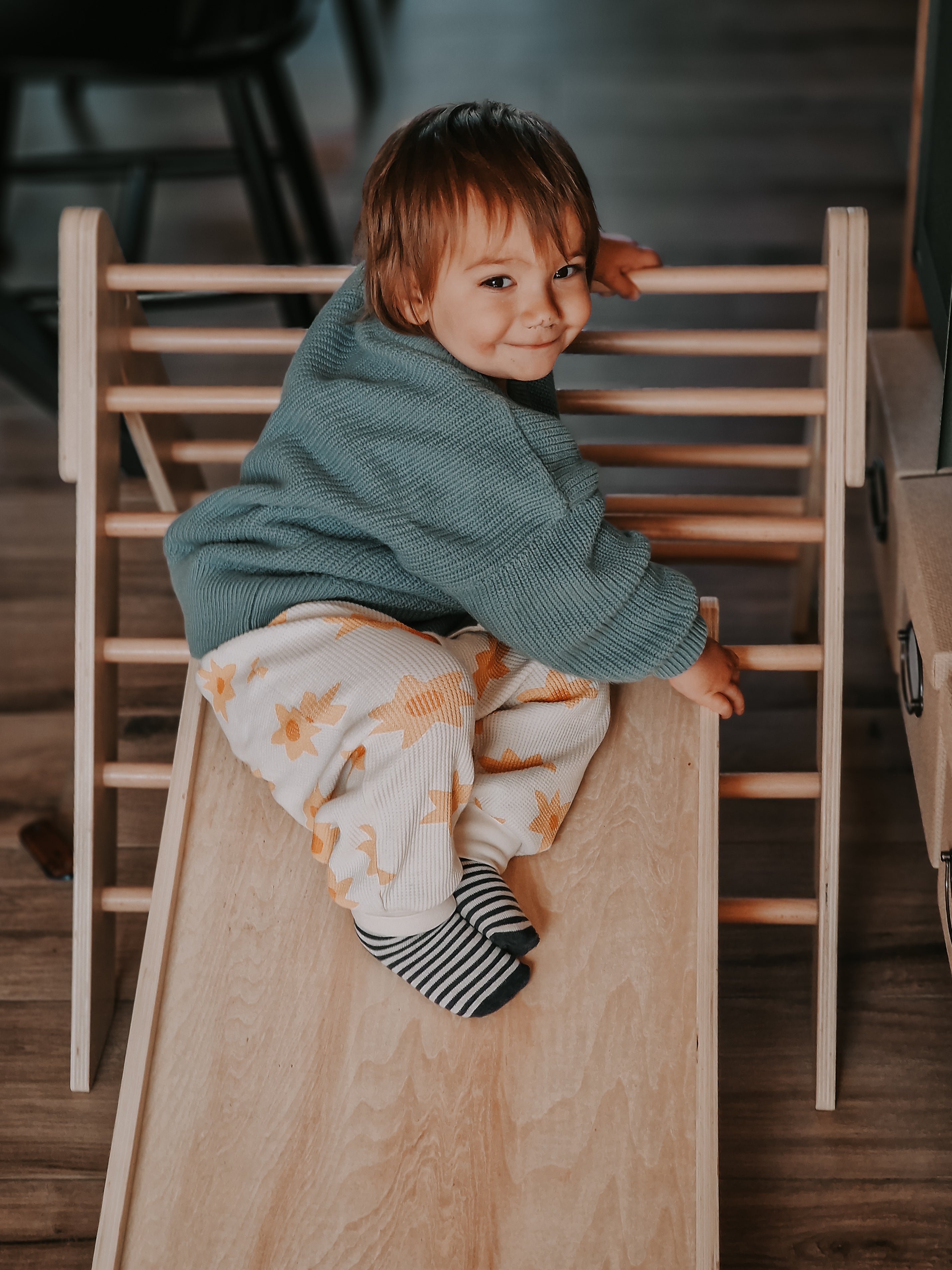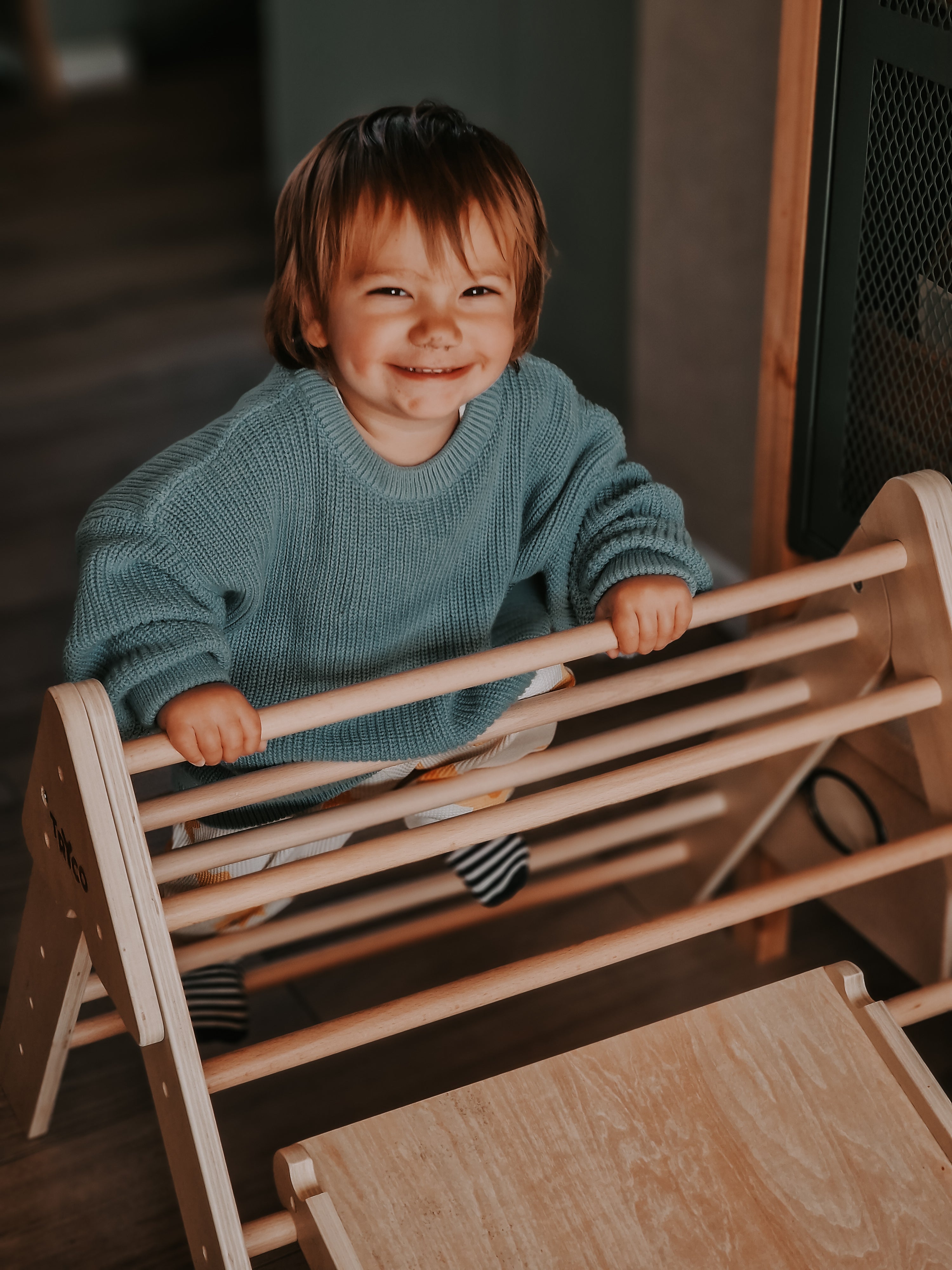 Je kan de glijbaan verstellen in 6 hoogtes. Je kan dit speelgoed ook makkelijk opbergen: haal de glijbaan eraf, maak twee schroefjes los aan het klimrek en klap deze dicht.