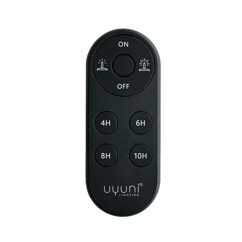 Bedien je Uyuni LED-kaarsen moeiteloos met de stijlvolle Uyuni Remote. Zet meerdere kaarsen tegelijk aan of uit, stel een timer in (4, 6, 8 of 10 uur) en pas de lichtintensiteit aan met de handige 3-staps dimmer. Zo creëer je in een handomdraai de perfecte sfeer, elke avond opnieuw.